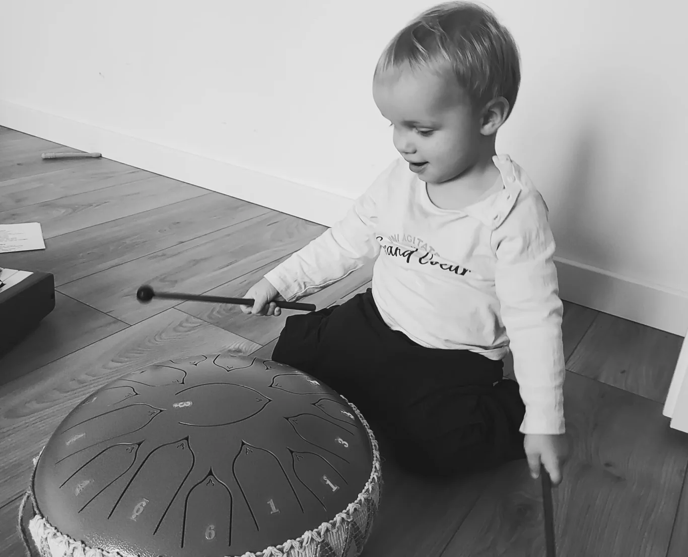 Exploration libre d'instruments de musique d'ici et d'ailleurs type Kalimba, djembé, tongue drum, maracasse, xylophone, triangle, cloche musicale, synthétiseur, guitare, guitalele, shaker africain, baton de pluie,...